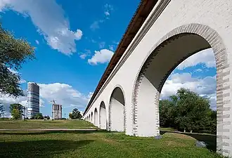 Мытищинский водопровод стал первым в Москве и в России, он был спроектирован по указу Екатерины II военным инженером Фридрихом Бауэром в 1778 году и проведён в Москву от ключевых источников Мытищ в 1779—1804 годах[2]. Из-за отсутствия у строителей опыта сооружения подобных систем, при проектировании Мытищинского водопровода были допущены ошибки и его приходилось постоянно реконструировать, а чтобы удовлетворить потребность в воде постоянно растущей столицы — достраивать и расширять. По расчётам Бауэра, подача воды должна была составить 300 тыс. вёдер в сутки, к 1858 году её довели до 500 тыс. вёдер, к 1892 — до 1,5 млн. Максимум Мытищинского водопровода был достигнут к 1903 году, когда потребление из сети составляло до 4 млн вёдер. К тому моменту Мытищинские ключи «надорвались»[30] и отдача воды из них существенно снизилась, ухудшился её состав и выросла жёсткость, река Яуза обмелела[31]. Столице срочно требовался новый источник питьевой воды, за неимением альтернатив им выбрали Москва-реку[32]. В столицу вода из Мытищинских ключей подавалась до 1962 года, к тому моменту от построенного при Екатерине II водопровода практически ничего не осталось. Памятником этому сооружению сохранился только Ростокинский акведук, Никольский и Петровский фонтаны[25][1].
