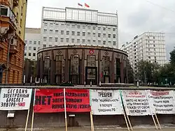 Здание Московской областной думы и протестные транспаранты на тротуаре проспекта Мира