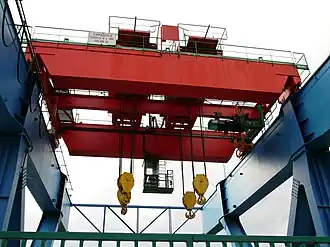 Эти краны отличаются от однопролётных тем, что несущая балка прикреплена к трём поперечным балкам, две из которых (концевые) являются приводными[1].