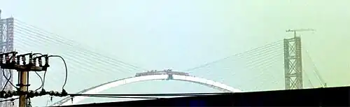 Строительство моста началось в октябре 2000 года. Так как власти города не хотели прерывать судоходство по реке, арка моста строилась так, чтобы ему не мешать — при помощи кантилеверного метода. На обоих берегах были построены временные башни — кантилеверы, и к ним по мере монтажа тросами крепились блоки арки. Сами блоки доставлялись баржами по реке и поднимались наверх с помощью лебёдок. Вес каждого блока составлял 100—150 тонн.[5] Строительство обошлось в 302 млн долларов США. На постройку центральной арки пошло более 35 000 тонн стали.[1] Мост был открыт 28 июня 2003 года