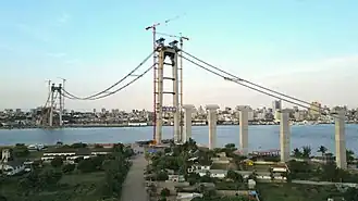 Первоначально опоры также планировались и в самой бухте, но после изменения плана их убрали, чтобы на создавать помех судоходству. Центральный пролёт — 680 м[11] Это делает его самым длинным подвесным мостом в Африке[12]. Каждый из основных поддерживающих тросов соединён прочным анкерным блоком со стальными конструкциями на севере и на юге. Чрезвычайно высокие нагрузки потребовали свайного фундамента диаметром от 1,5 до 2,2 м. Сваи погружены в дно залива на 110 м, высота двух пилонов составляет 141 м, проезжая часть находится на высоте 40 м. Отдельные сборные стальные элементы проезжей части имеют ширину 25,6 м и длину 12 м. Они были изготовлены в Китае и устанавливались с корабля[4].