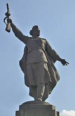 В северной части моста на высоких постаментах расположены статуи воинов — мужчины и женщины. Скульптор Николай Томский особое значение придавал их силуэтам. Согласно его замыслу, именно выразительные силуэты скульптур должны были создавать атмосферу напряжённости и тревоги, характерную для осени 1941 года[2].