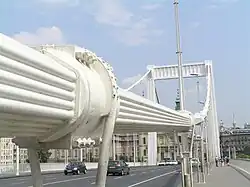 Мост Эржебет, Эржебет-хид (венг. Erzsébet híd) — висячий автодорожный мост через Дунай в Будапеште, соединяющий Буду и Пешт. Первый цепной мост был построен в 1898—1903 гг. На момент открытия он являлся крупнейшим среди мостов такого типа в мире (длина среднего пролёта — 290 м)[1][2]. Разрушен в 1945 году. Восстановлен в 1960—1964 гг., это последний из восстановленных после войны мостов через Дунай в Будапеште и единственный, который не был восстановлен в первоначальном виде. Силуэт моста, повторяя в общих чертах силуэт моста 1903 года постройки, позволил воссоздать прежний характер панорамы города, выразив историческую преемственность национальных архитектурно-художественных традиций. Выдающееся произведение архитектуры 1960-х гг.[3]