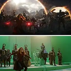 Компания Weta Digital работала над порталами вместе с супервайзером визуальных эффектов Мэттом Эйткеном, который сказал, что команде визуальной симуляции нужен был «рецепт», чтобы дизайн порталов можно было распознать как дизайн, принадлежащий Доктору Стрэнджу. Weta использовала оригинальную технику создания порталов из предыдущих фильмов КВМ, но слегка изменила их, поскольку «они должны ощущаться одинаковыми, потому что в прошлом их видели в более человеческом масштабе». Ещё одной проблемой было создание всех миров, из которых открывались порталы, поскольку все они были сгенерированы на компьютере. Это было необходимо, потому что окружение должно было быть снято той же камерой, что и разрушенный комплекс Мстителей по другую сторону портала, так, чтобы кадры могли «соединяться и параллаксировать»[17]. Команда VFX должна была сделать так, чтобы персонажи не казались выходящими из двумерного пространства, с помощью которого создан портал, а из объёмного трёхмерного[18]. Для персонажей, возвращающихся с Титана, были использованы четыре отдельные съёмочные платформы. Дракс и Мантис выходили вместе, а возвращение Стрэнджа снималось отдельно, поскольку персонаж летал в воздухе, из-за чего Бенедикт Камбербэтч снимался на зелёном экране. Том Холланд и Крис Прэтт были недоступны в тот день, поэтому для съёмок они прибыли позже, а Прэтта сняли с помощью отдельной части зелёного экрана с контролем движения[11].