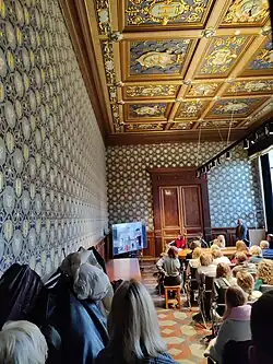 Прообраз декора зала — отделка дворца кардинала Александра Фарнезе в Пьяченце. Глубокие кессоны потолка вызолочены, центральная восьмиугольная розетка заполнена цветочным орнаментом. На торцовой стене — широкая кессонированная арка, стены покрыты золочёной кожей, на этом фоне были размещены беломраморные рельефы, созданные скульптором Ломбарди. В параллельных окнам витринах стояли сосуды из горного хрусталя с золотыми ободками и узорами из эмали, табакерки и шкатулки, кувшины из венецианского стекла с венецианской нитью[39].