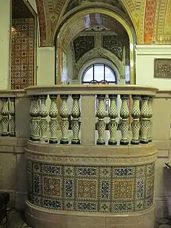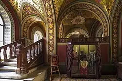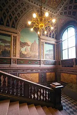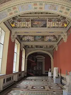 На второй этаж ведёт широкая боковая лестница, объединяющая музей с училищем. В её арочных проёмах — живописное панно П. И. Долгова, на котором изображён римский собор Святого Петра[32].