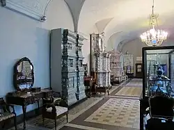 Среди экспонатов — немецкие деревянные статуи двенадцати апостолов, копия скульптуры Мадонны из Собора Парижской богоматери, скульптура лежащего рыцаря, изваяния святых Екатерины, Варвары, Маргариты и Вероники, французские лиможские эмали (навершия посохов, реликварии, оклады переплётов), различная утварь со слоновой костью (ларцы для драгоценностей, коробочки для зеркал и пр.), серебряные тарелочки (вероятно, для пряностей) с прозрачной эмалью, собрание древних книг, деревянные резные ларцы, изделия из кожи. В окнах зала были цветные стёкла, на торцах висели ковры и завесы, в том числе «Мадонна, архангел Михаил и святой» (Германия, 1477 год). В простенках стояли готические шкафы, комоды, сундуки и кресла[29].