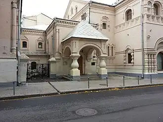 с 1903 по 1999 год музей размещался в здании, купленном предпринимателем, известным меценатом Сергеем Тимофеевичем Морозовым у А. И. Мамонтова и перестроенном специально для музея по проекту С. У. Соловьева[4]. В 1911—1913 годах по проекту архитекторов А. Э. Эрихсона и В. Н. Башкирова была осуществлена пристройка второго этажа с мезонином, правого крыла для помещения торгового отдела[13].