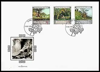 Конверт с почтовыми марками Лихтенштейна, посвящённый И. Г. Мясоедову и его творчеству, 1996  (Mi #1138—1140; Sc #1089—1091)
