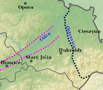 Францисканский вице-министр в Богемии Джордано Джано,[b] который писал письма из Праги, пока монголы находились в Моравии, указывает, что они прошли через Моравские ворота до 9 мая. По другим источникам, Орда-Эджен находился в Венгрии к концу апреля, поэтому переход Моравии, похоже, длился меньше месяца.[c] Скорость перехода упоминается в двух других источниках: Магистр Рогерий замечает об этом, а в Annales Santi Pantaleonis с гиперболой отмечается, что, хотя переход должен был занять четыре дня, монголы пересекли Моравию за один день и одну ночь.[28][34] Монголы, вероятно, вышли из Моравии через Новы-Грозенков, который Магистр Рогерий называет Венгерскими воротами. Путь, которым монголы прошли через Моравию, неизвестен. Они воссоединились с основными силами под командованием Батыя возле Тренчина в Венгрии..[28]