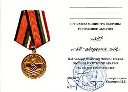 Медалью Министерства Обороны Республики Абхазия «За боевое содружество награждаются военнослужащие и лица гражданского персонала Вооружённых Сил Республики Абхазия за заслуги в формировании и реализации политики в области международного военного сотрудничества и военно-технического сотрудничества Республики Абхазия с иностранными государствами и международными организациями, а также другие граждане Республики Абхазия и иностранные граждане, оказывающие содействие в решении задач, возложенных на Вооруженные силы Республики Абхазия. Награждение медалью «За боевое содружество» производится приказом Министра обороны Республики Абхазия по представлению командиров воинских частей и подразделений. ![]() |