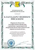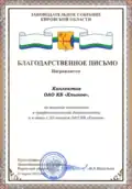 Благодарственное письмо Правительства Кировской области является формой поощрения за достижения в решении определённых социально-экономических задач области, осуществление конкретных общественно значимых для области дел, выполнение особо важных заданий, способствующих социально-экономическому развитию области, за успешное участие в выставках, конкурсах и иные достижения. Благодарственным письмом могут быть награждены граждане Российской Федерации, лица без гражданства, иностранные граждане, имеющие общий трудовой стаж не менее 5 лет в организациях, осуществляющих свою деятельность на территории Кировской области, и стаж работы по последней должности (профессии или специальности) не менее 2 лет, чьи заслуги отмечены документально подтверждёнными поощрениями органов государственной власти, органов местного самоуправления, иных организаций. Благодарственным письмом могут быть награждены юридические лица, осуществляющие свою деятельность на территории Кировской области не менее 5 лет. |