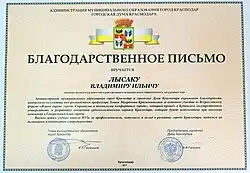 Почётная грамота и Благодарность муниципального образования город Краснодар |
