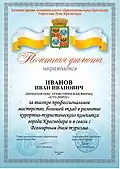 Почётная грамота и Благодарность администрации Краснодарского края являются одной из форм поощрения граждан Российской Федерации и других государств, трудовых коллективов и организаций за многолетний добросовестный труд, профессиональное мастерство, существенный вклад в социально-экономическое развитие Краснодарского края, осуществление мер по обеспечению законности, прав и свобод граждан, укрепление межнационального мира и согласия, активное участие в проведении особо значимых мероприятий и иную деятельность, способствующую развитию края, а также за безупречную и эффективную государственную гражданскую службу. |