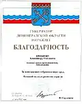 Награждение Почётной грамотой Губернатора Ленинградской области является формой поощрения за заслуги в защите Отечества и обеспечении безопасности государства, укреплении законности, охране здоровья и жизни, защите прав и свобод граждан, государственном строительстве, экономике, науке, культуре, искусстве, воспитании, просвещении, спорте, благотворительной деятельности и иные заслуги. Почётной грамотой Губернатора Ленинградской области награждаются граждане Российской Федерации, проработавшие в Ленинградской области не менее пяти лет и имеющие указанные выше заслуги. |