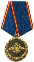 Медаль «За вклад в укрепление правопорядка»[4] 31 октября 2012 Медалью МВД России «За вклад в укрепление правопорядка» награждаются федеральные государственные гражданские служащие, работники системы МВД России, граждане Российской Федерации и иные лица за значительный вклад в укрепление правопорядка, совершенствование правового регулирования деятельности органов внутренних дел, подготовку квалифицированных кадров для органов внутренних дел, оказание содействия органам внутренних дел Российской Федерации в выполнении возложенных на них задач.