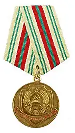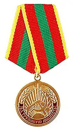 Медаль «За отличие в труде» | Медалью «За отличие в труде» награждаются граждане иностранных государств и Приднестровской Молдавской Республики, которые достигли высоких результатов в области трудовой деятельности, государственной службы и общественной деятельности, укреплении обороны, государственной и национальной безопасности, охране общественного порядка и борьбы с правонарушениями. |