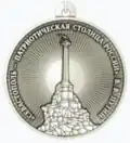 Медаль «Город-герой Севастополь» учреждена в ознаменование 75-летия освобождения города Севастополя от немецко-фашистских захватчиков и 165-й годовщины первой обороны города в Крымской войне 1853—1856 годов, и является общественной юбилейной медалью. Медалью «Город-герой Севастополь» награждались граждане, обеспечившие своим трудом, государственной, общественно-политической, научной, образовательной, культурной, спортивной, благотворительной и иной деятельностью социально-экономическое развитие города Севастополя, внесшие существенный вклад в военно-патриотическое воспитание молодёжи. Медаль носится на левой стороне груди ниже государственных и ведомственных наград. |