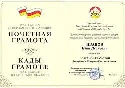 Почётной грамотой Республики Северная Осетия — Алания награждаются граждане и коллективы организаций и учреждений, отличившиеся в общественной, производственной и научной деятельности, в развитии культуры, литературы и искусства, за вклад в укрепление мира и дружбы между народами, активное участие в миротворческой деятельности. |