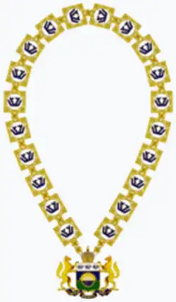• обрамлённый орнаментом объёмный герб Тюменской области из цветных и благородных металлов. На оборотной стороне герба имеется надпись «Знак Губернатора Тюменской области»;