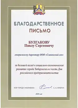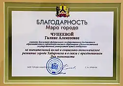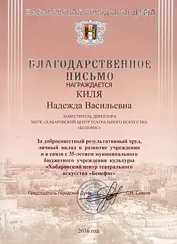 Благодарственное письмо Хабаровской городской Думы[5] |