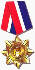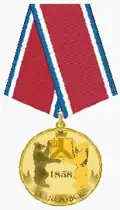 Медаль «За вклад в развитие города» представляет собой знак, выполненный в форме двух четырехугольников, налагаемых друг на друга и образующих восьмиконечную звезду диаметром 44 мм. В центре звезды находится круг диаметром 24 мм, в котором расположен герб города Хабаровска, выполненный тиснением на золоте и представляющий собой изображение щита, разделенного вертикально на три равные части. В правой и левой частях стоящие на задних лапах стилизованные фигуры медведя и уссурийского тигра поддерживают прежний герб города Хабаровска, в нижней части щита дата образования города - 1858. В верхней части круга Медали размещена надпись: «За вклад в развитие города», в нижней части круг обрамлен колосьями. На оборотной стороне Медали в центре расположено объемное изображение Ерофея Павловича Хабарова и надпись «Хабаровск». Все изображения и цифры на Медали рельефные. Медаль при помощи ушка и кольца соединяется с пятиугольной колодкой, обтянутой муаровой лентой с продольной полоской посередине, белого цвета, составляющей 1/5 ширины ленты, и полосами красного и синего цвета по краям. Ширина ленты - 24 мм. |