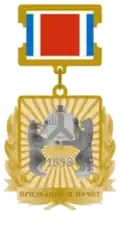 Почётный знак «За заслуги» изготавливается из латуни и имеет форму правильного круга диаметром 34 мм. На лицевой стороне знака - рельефное изображение стоящих на задних лапах стилизованных фигур черного белогрудого медведя и уссурийского тигра с языками, высунутыми из пасти, которые поддерживают прежний (старый) герб города Хабаровска. Под изображением прежнего (старого) герба города Хабаровска - рельефная надпись в одну строчку «1858», под которой рельефное изображение сложенной по краям ленты с надписью «ХАБАРОВСК». На оборотной стороне в центре - надпись рельефными буквами в две строки «ЗА ЗАСЛУГИ». По нижнему краю круга рельефное изображение двух перекрещивающихся лавровых ветвей. Знак соединяется при помощи ушка и кольца с пятиугольной колодкой шириной 46 мм, высотой 50 мм, обтянутой шелковой муаровой лентой с полосами красного, белого и синего цвета. Ширина красной полосы 15 мм, ширина синей и белой полосы 5 мм. В нижнем углу колодки находится фигурный вырез для прикрепления ее к знаку. Колодка со знаком при помощи булавки крепится к одежде. |