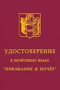 - ↑ Положение о нагрудном знаке «Признание и почёт». Дата обращения: 9 августа 2020. Архивировано 21 апреля 2021 года.
