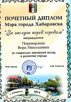 Почётный диплом Мэра города Хабаровска «За заслуги перед городом»[7] |