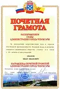 Награждение Почётной грамотой администрации города Чебоксары производится за особый личный вклад в социальное, экономическое, культурное развитие города Чебоксары, является одним из важнейших моральных стимулов и призвано способствовать повышению трудовой и общественной активности граждан. Почётной грамотой награждаются граждане Чувашской Республики, субъектов Российской Федерации, других государств своим трудом заслужившие широкую известность благодаря личному вкладу в развитие города. Почётной грамотой также могут быть награждены предприятия, учреждения, организации, общественные объединения и районы города Чебоксары. Представление к награждению Почётной грамотой производится не ранее, чем через 3 года после поощрения Почётной грамотой администрации района города Чебоксары. Отдел делопроизводства администрации города ведёт учёт награждённых Почётной грамотой. |