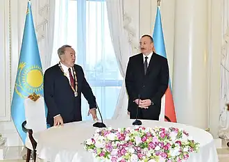 - ↑ Распоряжение Президента Азербайджанской Республики о награждении Нурсултана Назарбаева орденом «Гейдар Алиев». Дата обращения: 3 апреля 2017. Архивировано 8 октября 2017 года.
