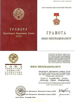 - ↑ Указ Президиума Верховного Совета СССР N 9964-XI «Об учреждении Грамоты Президиума Верховного Совета СССР воину-интернационалисту»