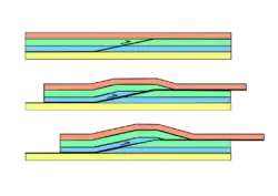 - надвиг скалывания — сформировавшийся независимо от складчатости. Может пересекать и горизонтальные, и смятые в складки пласты.
