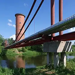 Висячие трубопроводы надземных переходов трубопроводов, в которых трубы подвешиваются к несущим элементам — тросам (канатам), вантам, цепям и т. п., сооружаются при пересечении протяжённых преград (ущелье, водные объекты и другие) шириной более 50-60 м, однако, известны висячие трубопроводы c пролётами длиной 200—400 м и более[5]. Так, например, построен крупнейший висячий мост через Амударью в 1964 году в Евразии[6] с возможностью пропуска автомобильной нагрузки под две нитки газопровода через реку Амударью (длина основного пролёта 390 м), соединяющий Хорезмскую область Узбекистана и Лебапский велаят (бывшую Чарджоускую область) Туркмении.