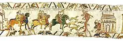 | 10 | Эта и следующие две сцены показывают события, изображённые в обратном порядке. Двое посланников прибывают от сеньора графа Ги — герцога Нормандии Вильгельма, чтобы потребовать освобождения Гарольда | UBI NUNTII WILLELMI DUCIS VENERUNT AD WIDONE[M] | где послы герцога Вильгельма прибывают к Видо | ![]() |