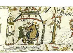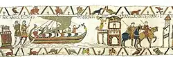 | 6 | Корабль пристаёт к Понтье, территории графа Ги, находящейся к северу от Нормандии. Гарольд показан дважды. Слева он стоит на корабле, готовом пристать к берегу. Как только он сходит на берег, его схватывают солдаты графа Ги | HAROLD | Гарольд | ![]() |
