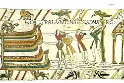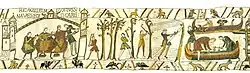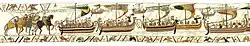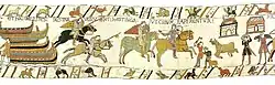 | 39 | Армия Вильгельма достигает южного побережья Англии 28 сентября 1066 года и высаживаются на землю в Пэвенси | HIC EXEUNT CABALLI DE NAVIBUS | Здесь выводят лошадей с кораблей | ![]() |