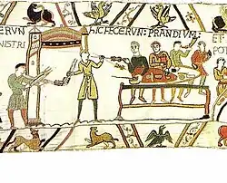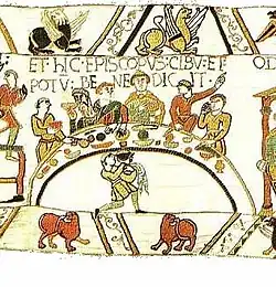 | Вильгельм садится за пир со своими аристократами, а епископ Одо произносит молитву перед едой | HIC EPISCOPUS CIBU[M] ET POTU[M] BENEDICIT | А здесь епископ благословляет еду и питьё | ![]() | |