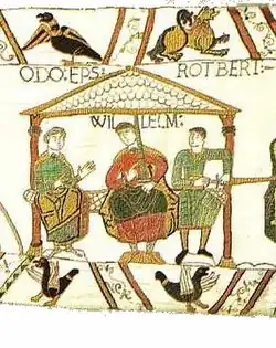 | 44 | Герцог Вильгельм беседует со своими сводными браться Одо и Робертом, графом де Мортеном | ODO EP[ISCOPU]S WILLEM[US] ROTBERT | епископ Одо, Вильгельм, Роберт | ![]() |