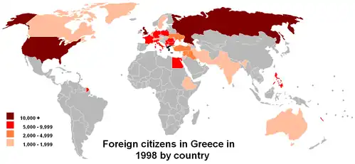 Этнические группы Греции по гражданству по состоянию на 2011 год: 91,6% греки, 4,4% албанцы, 4% другие.[22] Греция не собирает данные об этнической принадлежности.[22]