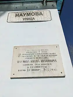 Иван Иванович Наумов (1911, станция Кайсацкая — 25 ноября 1942, Сталинград) — старший лейтенант, командир 7-й стрелковой роты 42-го гвардейского стрелкового полка 13-й гвардейской стрелковой дивизии, участник Сталинградской битвы. Один из организаторов обороны Дома Павлова. Его имя увековечено в названии одной из улиц Центрального района.