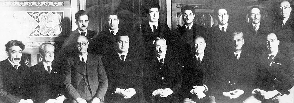 Первые члены Президиума АН АзССР, 1945 г. Нижний ряд (слева направо, сидят): поэт С. Вургун, учёный-гидравлик И. Г. Есьман, У. Гаджибеков, А. А. Ализаде, президент Академии М. Миркасимов, И. И. Широкогоров, А. А. Гроссгейм, М. А. Топчибашев (учёный, хирург). Стоят: Ю. Мамедалиев, М. А. Ибрагимов, Ш. А. Азизбеков, Г. Н. Гусейнов, Мир-Али Кашкай, С. А. Дадашев, М. А. Усейнов[4]