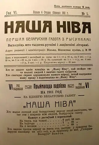 Начала выходить в Вильне с 10 (23) ноября 1906 по 7 августа 1915 на белорусском языке кириллицей и с первого номера до № 42, 18 (31) октября 1912) также белорусской латиницей, с заглавиями «Наша Ніва» и «Nasza Niwa».