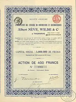 В Таганрог Альберт Нев прибыл в конце 1895 года, по настоянию своего дяди, влиятельного промышленника, директора предприятия «Société d’Ougrée» по производству стали в пригороде Льежа и Таганрогской Металлургической Компании — Густава Тразанстэра[2]. Там Нев руководил строительством административного здания компании «Альберт Нев, Вильде и К°»[2]. 23 апреля 1899 года были утверждены условия деятельности в России Бельгийского акционерного общества под наименованием «Анонимное Общество для эксплоатаціи машиностроительнаго и котельнаго заводовъ Альберт Невъ, Вильдъ и Ко въ Таганрогѣ», с которыми можно ознакомиться в Третьем собрании Законов Российской империи[5].