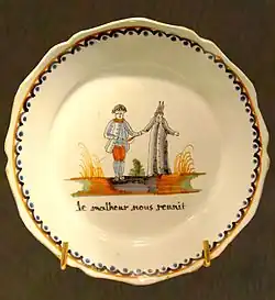 Интересно, что наиболее ранние примеры патриотического фаянса включали промонархические изделия[21]. Революционный патриотический фаянс относится к широкой группе так называемого «говорящего» фаянса и фарфора, росписи которого часто имели комический или сатирический оттенок[22]. Другой тип изделий в этом жанре изображал святого-покровителя получателя и предназначался в качестве подарка на крестины или на день рождения. Подобные изделия выполнялись и на других мануфактурах, но именно неверский фаянс был ведущим производителем[23].