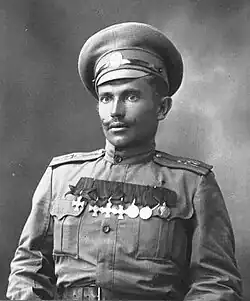 - Георгиевский крест 4-й ст. за отличие в бою с турками 11 декабря 1914 года (№ 213489)