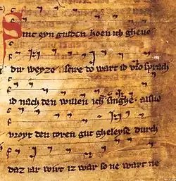 Песня Sinc eyn gulden hoen Нейдхарта в оригинальной записи. Франкфуртский фрагмент, ок. 1300