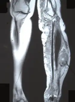 Длинные трубчатые кости могут быть атрофичными, изогнутыми, иногда же, наоборот, гипертрофированными, утолщёнными. Компактное вещество в гипертрофированной кости утолщено. На поверхности кости видны периостальные гребни, иногда обнаруживаются и параостальные окостенения. Внутрикостные нейрофибромы в трубчатых костях выглядят как ограниченные вздутия и кистовидные образования[36].