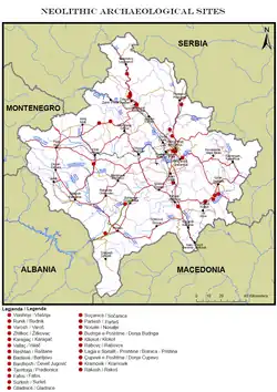 Неолитические памятники Косова встречаются по всей его территории. Теплый, влажный климат голоцена[1], наступивший вскоре после окончания последнего ледникового периода, отразился на людях, флоре и фауне. Эта стабилизация климата повлияла на жизнедеятельность человека, произошли изменения в организации общин, появились постоянные поселения в засушливых местах, вблизи берегов рек и на плодородных плато.