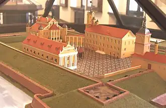 Ближе к центру замка, перпендикулярно помещению дворца, показана другое большое строение. Это здание имеет закруглённый фронтон, что позволяет рассматривать его как культовое помещение, построенное в стиле готической базилики. На противоположном фасаде этого здания просматривается крест. Скорее всего, учитывая религиозные взгляды Николая Радзивилла Чёрного, тут размещалось кальвинистское собрание.